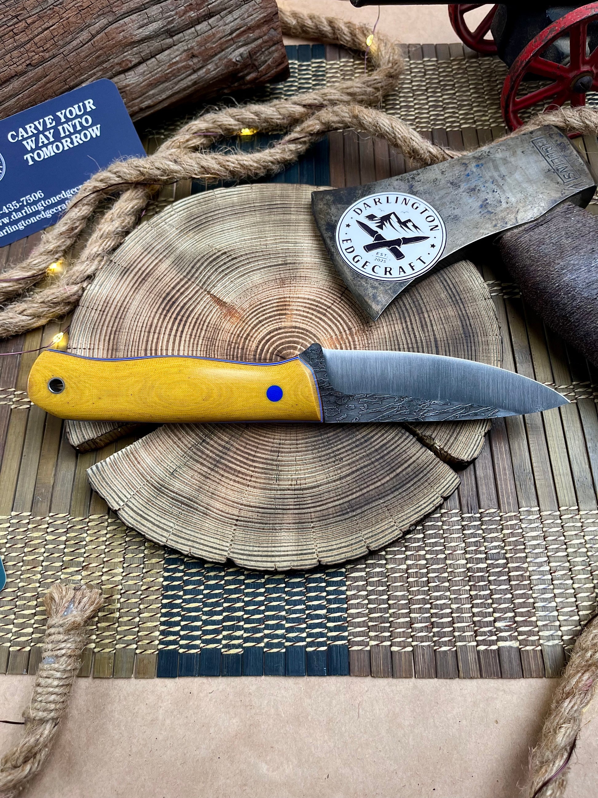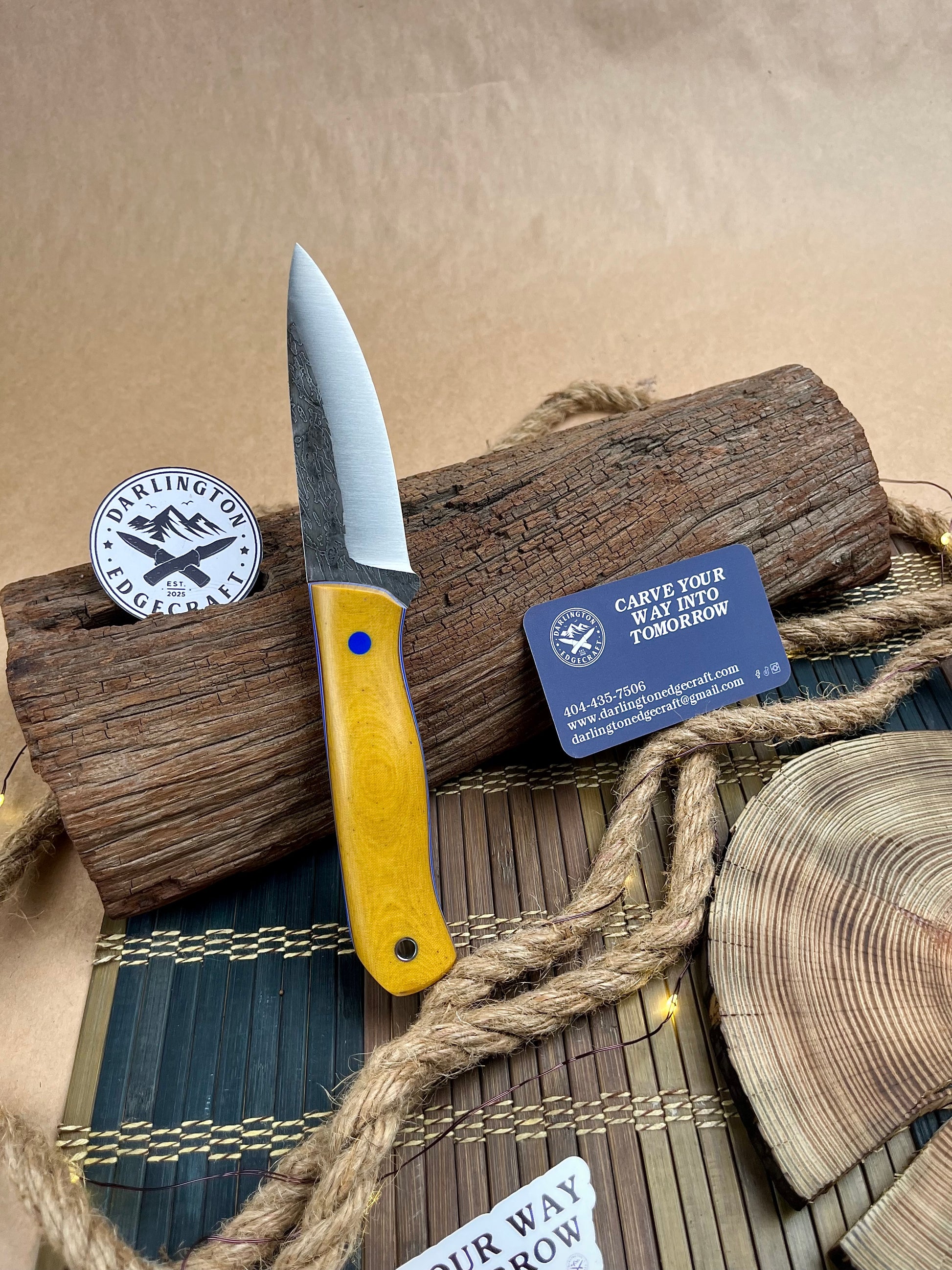 Handle Material: Vintage Linen Micarta. White-Blue-White g10 racing stripes on natural micarta liners.