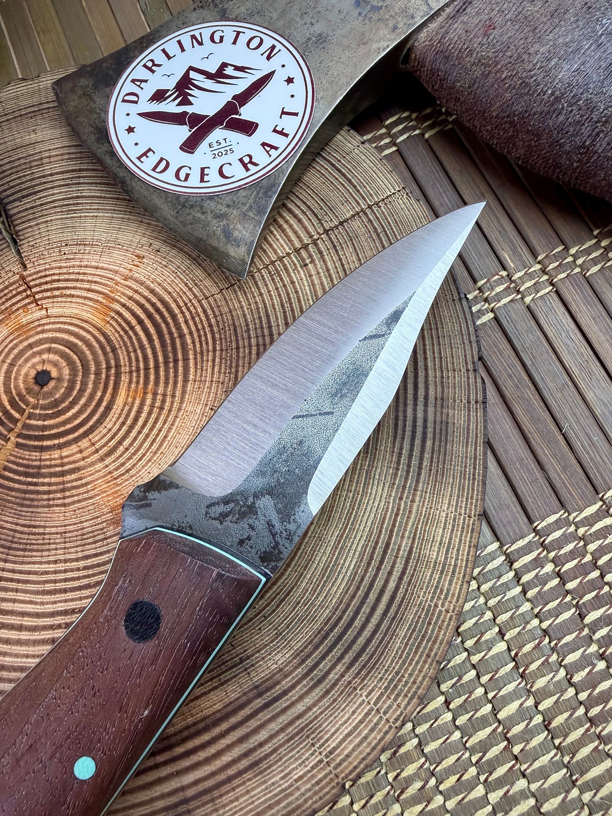 Handle Material: Warm curly walnut. Tiffany blue g10 pinstripe on black micarta liners