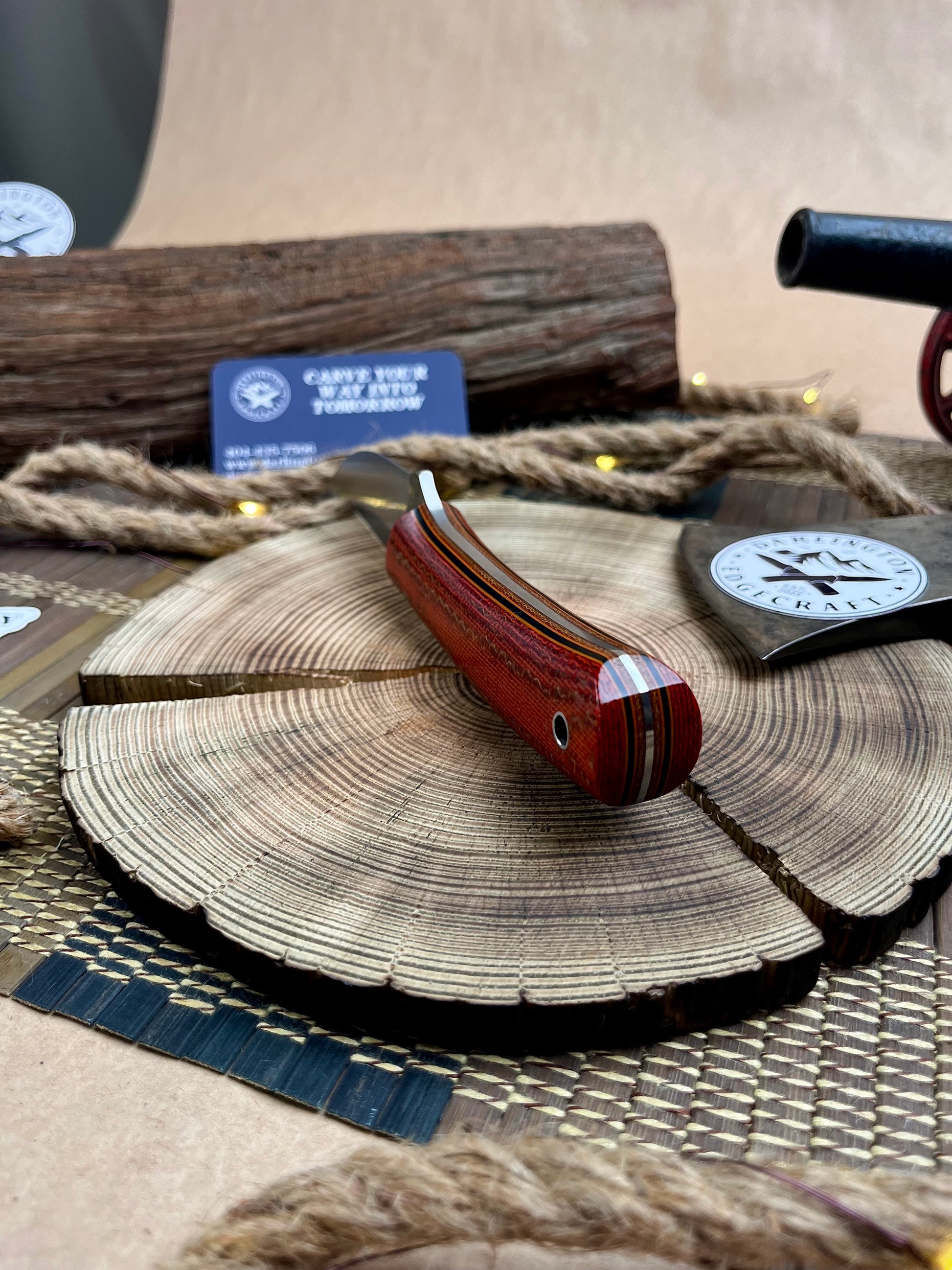 Handle Material: Bright Thermite Burlap. Orange-Black-Orange racing stripes on natural micarta liners.