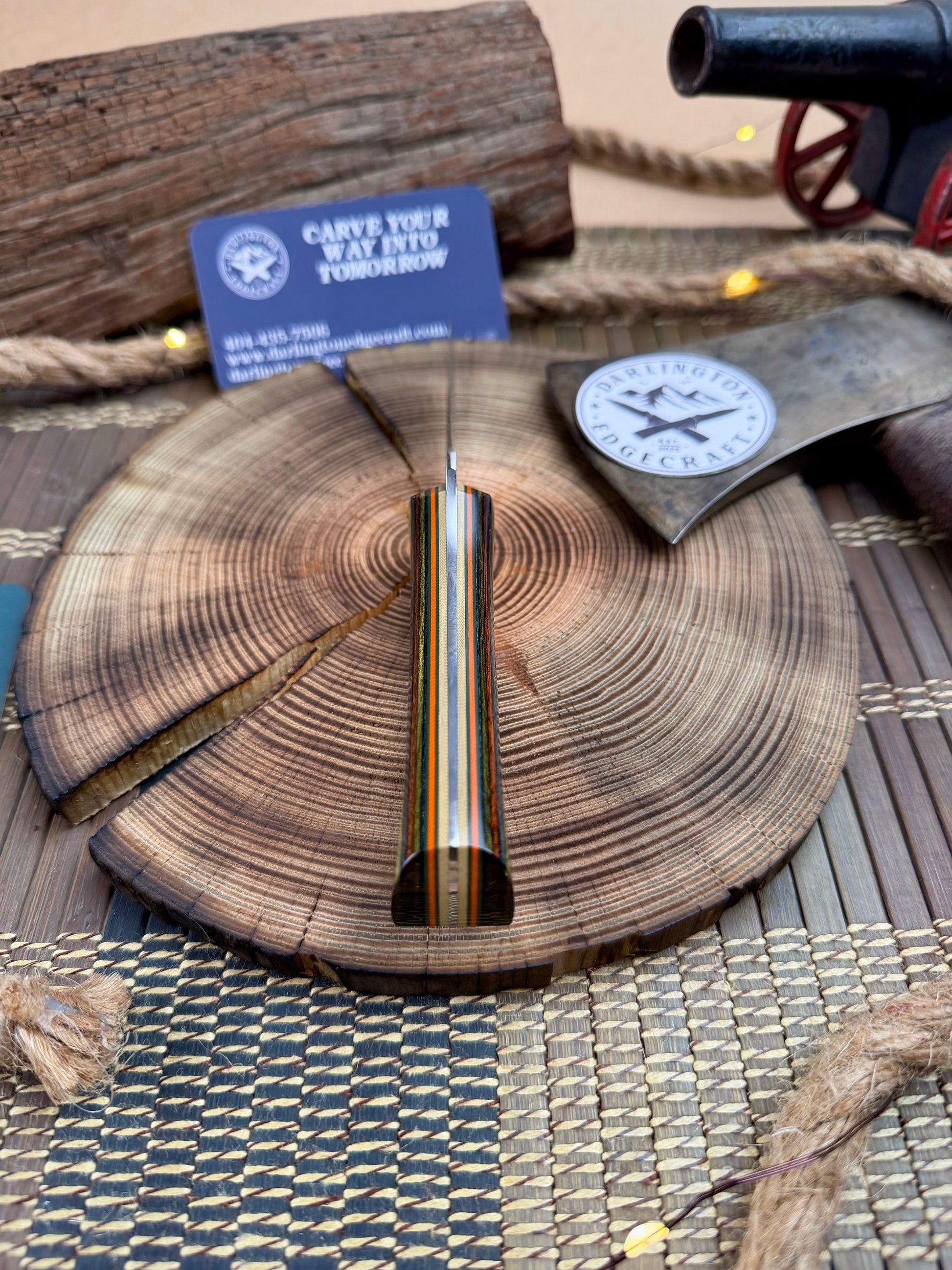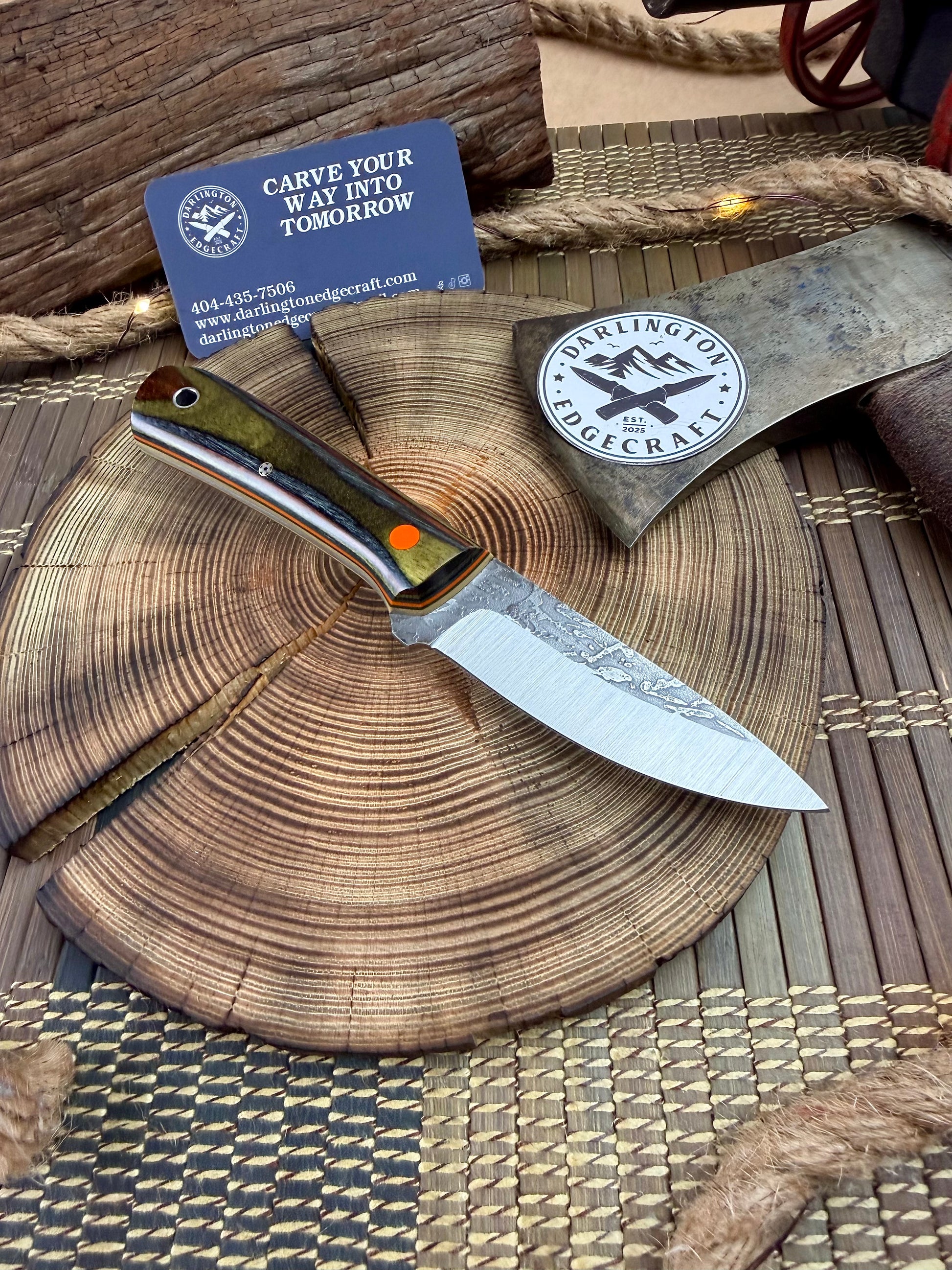 Handle Material: Green Mountain Dymalux. Forest-Orange-Forest G10 racing stripes on Sand G10 liners