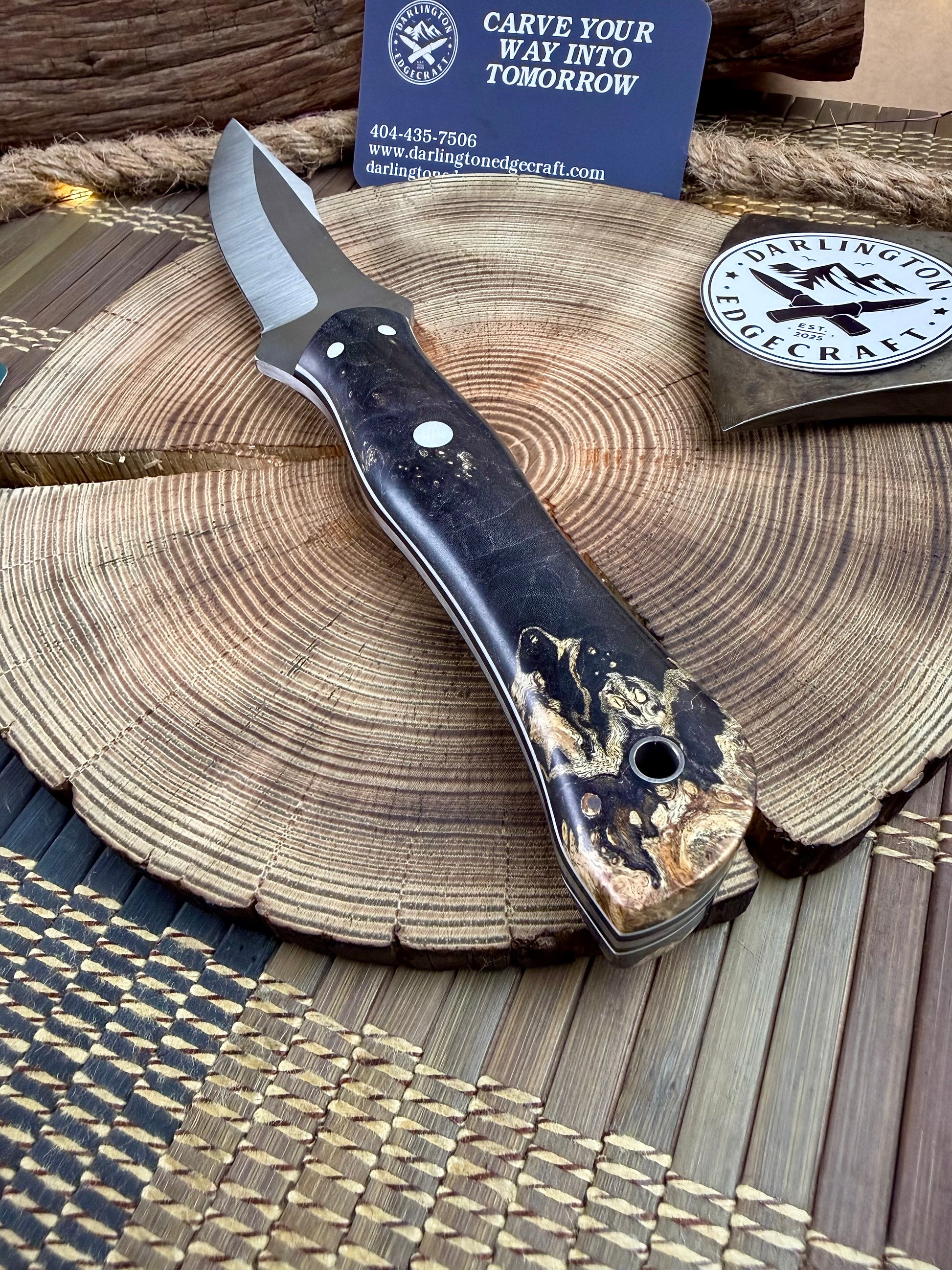 Handle Material: Stabilized black maple burl. White g10 pinstripes on black micarta liners